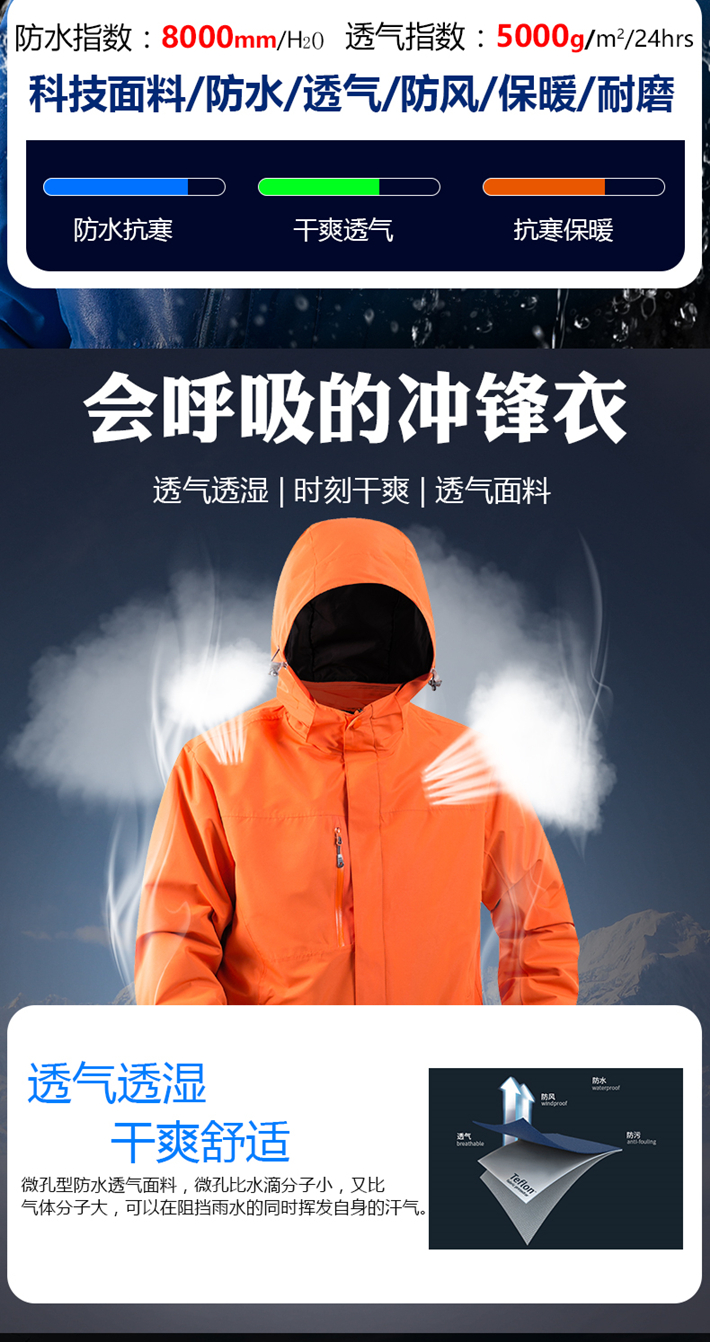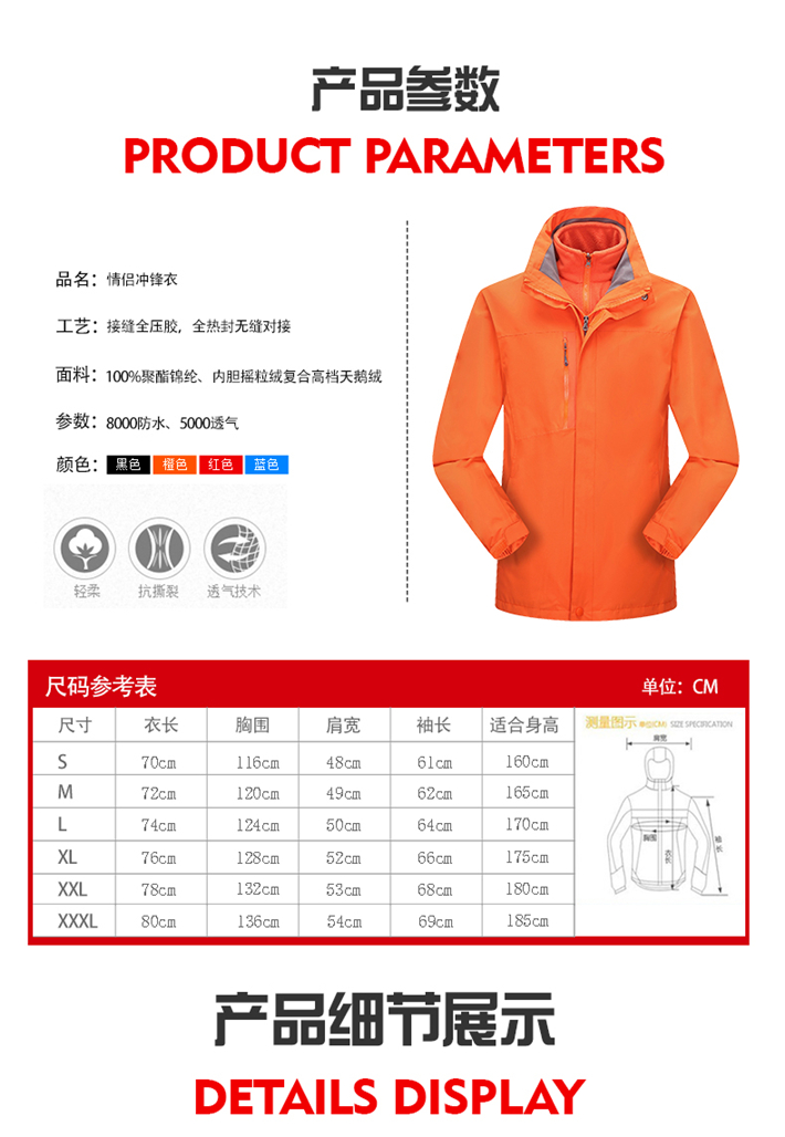 生產工藝:采用拉鏈壓膠防水工衣,可拆卸內膽、袖口松緊魔術貼