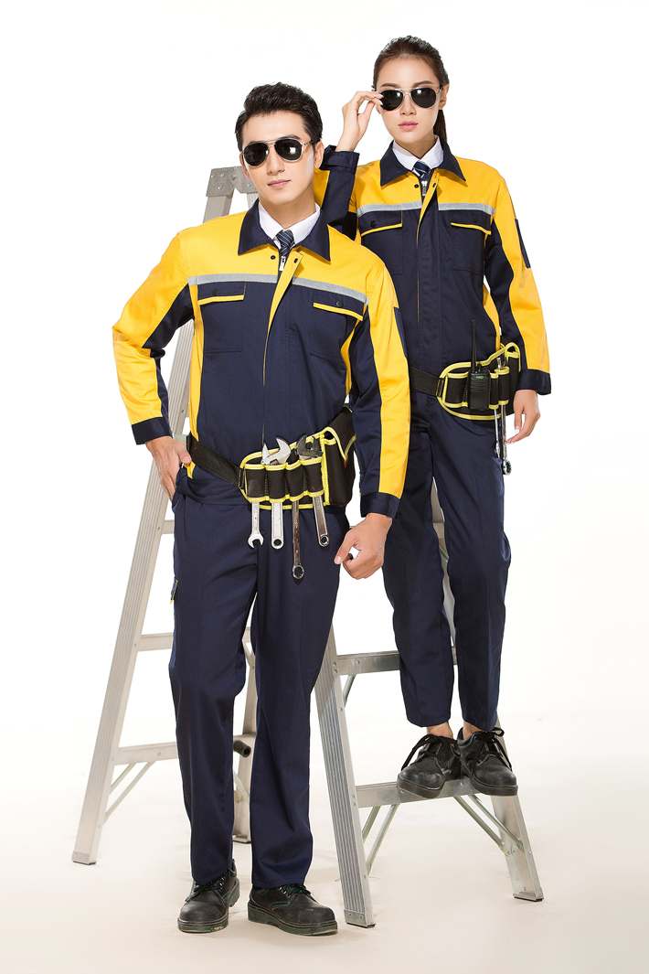 滌棉藏青色拼黃色反光條工作服長袖套裝GZ-8015